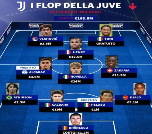 北京时间1月26日,德转评出了尤文图斯队史冬窗失败引援的11人阵容,他们在2022年冬窗花费8350万欧元引进的弗拉霍维奇在列,亨利、卢卡-托尼以及卡尔达拉上榜。